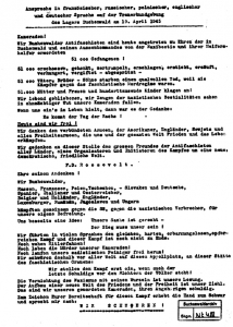 „Wir stellen den Kampf erst ein, wenn auch der letzte Schuldige vor den Richtern der Völker steht! Die Vernichtung des Nazismus mit seinen Wurzeln ist unsere Losung. Der Aufbau einer neuen Welt des Friedens und der Freiheit ist unser Ziel.“