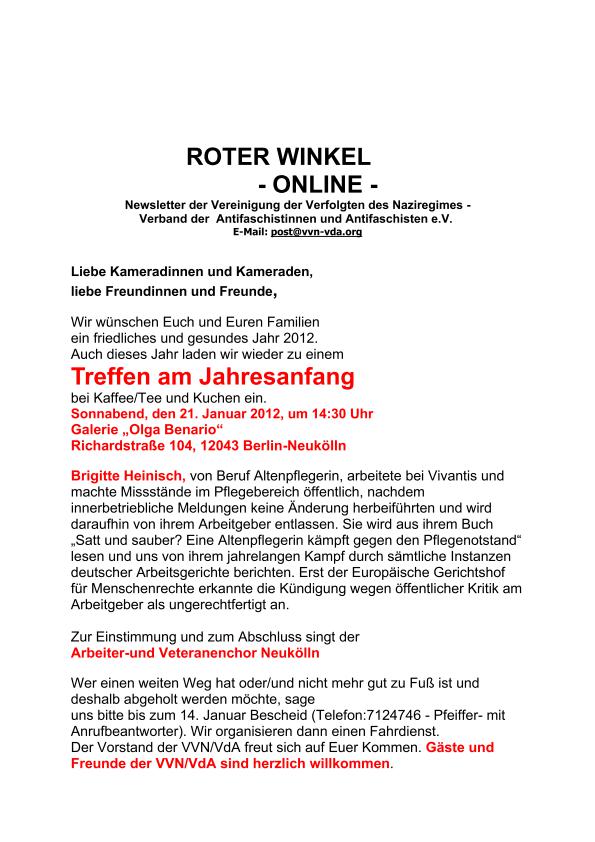 Seit 2012 informiert die VVN-VdA Mitglieder und interessierte AntifaschistInnen mit einem eigenen Email-Rundbrief, den Roten Winkel.