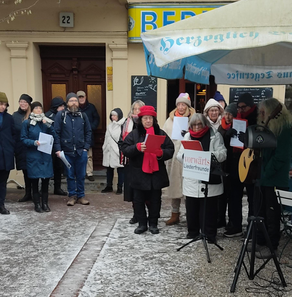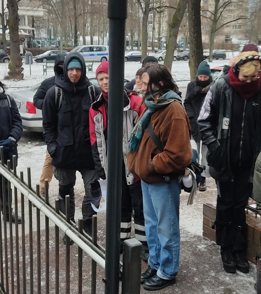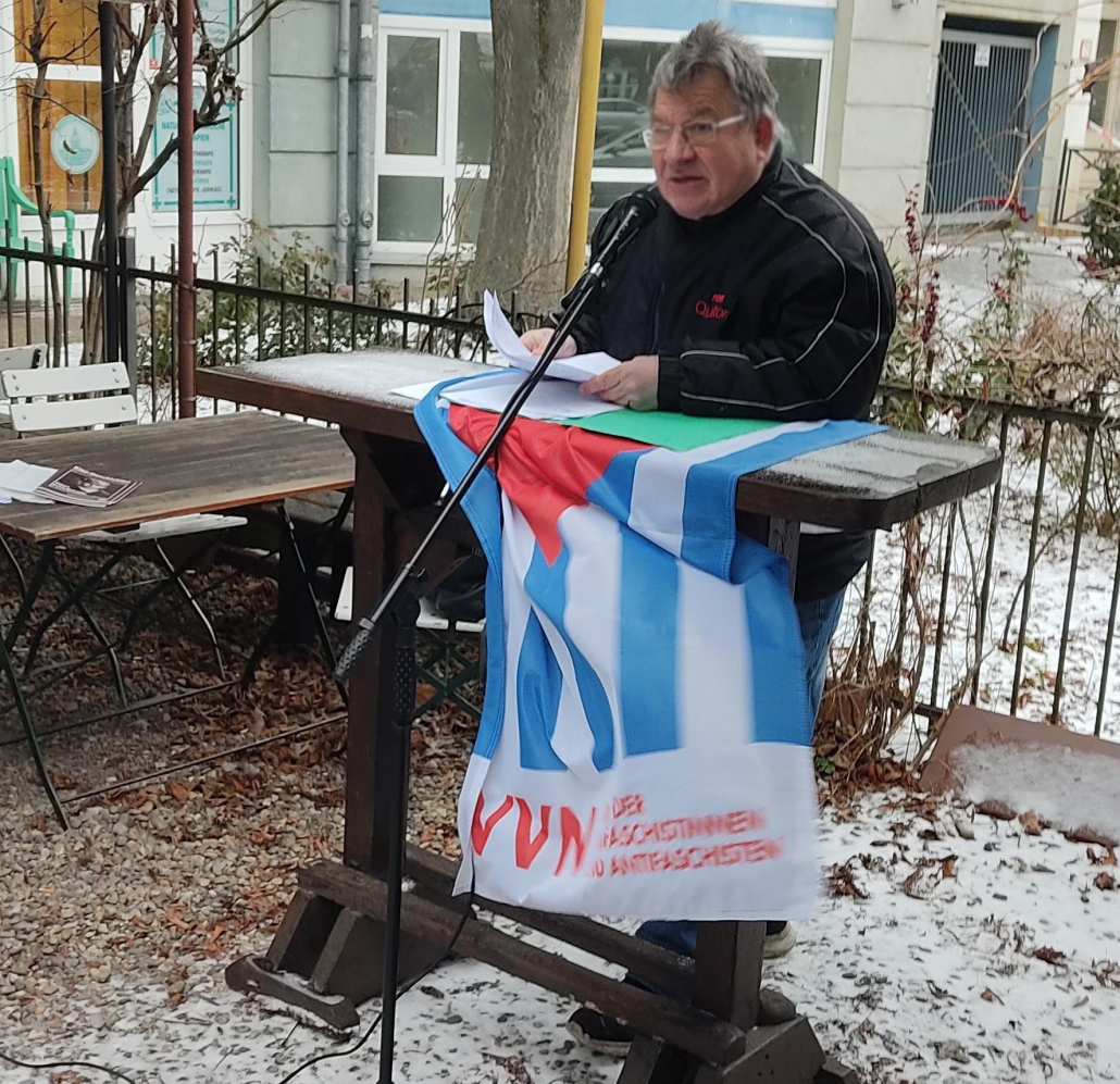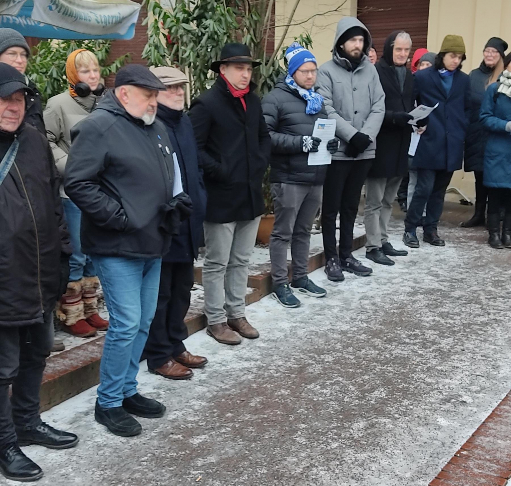 Aus diesem Anlass hielten etwa 70 Anwesende deutlich mehr als eine Stunde aus bei eisiger Kälte und kämpferischen Reden von insgesamt 8 Rednerinnen und Rednern. (Uwe Bröckl, Vorstand VVN-VdA Berlin; Enrico Brehm, Bezirksvorstand Die Linke; Christoph Wapler, MdA Die Grünen; Olivia Schmitt, DKP; Uwe Hiksch, stv. Landesvorsitzender Die NaturFreunde; Timur Saric, SPD-Bezirksverordneter; Flip, FaJOC; Max Renkl, Freundeskreis Ernst Thälmann). Musikalisch begleitet wurde die antifaschistische Veranstaltung des Bündnisses unter Federführung der Westberliner VVN-VdA von den VORWÄRTS Liederfreunden mit kämpferischen Liedern der Arbeiterbewegung.